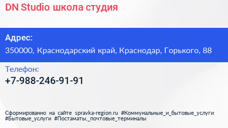DN Studio, школа-студия по адресу 350000, Краснодарский край, Краснодар, Горького, 88 в дальнейшем Организация, размещена в следующих категориях:
