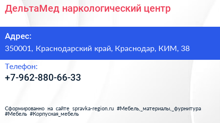 ДельтаМед, наркологический центр по адресу 350001, Краснодарский край, Краснодар, КИМ, 38 в дальнейшем Организация, размещена в следующих категориях: