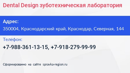Dental Design, зуботехническая лаборатория по адресу 350004, Краснодарский край, Краснодар, Северная, 144 в дальнейшем Организация, размещена в следующих категориях: