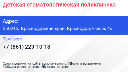 Детская стоматологическая поликлиника по адресу 350915, Краснодарский край, Краснодар, Новая, 46 в дальнейшем Организация, размещена в следующих категориях:
