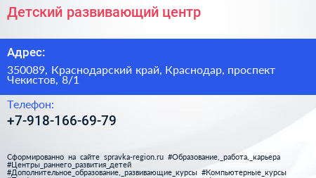 Детский развивающий центр по адресу 350089, Краснодарский край, Краснодар, проспект Чекистов, 8/1 в дальнейшем Организация, размещена в следующих категориях: