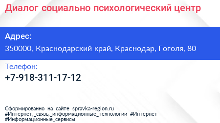 Диалог, социально-психологический центр по адресу 350000, Краснодарский край, Краснодар, Гоголя, 80 в дальнейшем Организация, размещена в следующих категориях:
