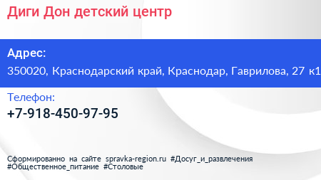 Диги-Дон, детский центр по адресу 350020, Краснодарский край, Краснодар, Гаврилова, 27 к1 в дальнейшем Организация, размещена в следующих категориях: