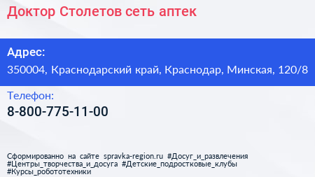 Доктор Столетов, сеть аптек по адресу 350004, Краснодарский край, Краснодар, Минская, 120/8 в дальнейшем Организация, размещена в следующих категориях: