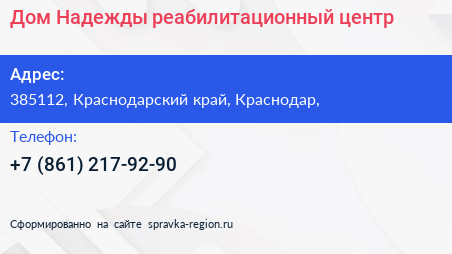 Дом Надежды, реабилитационный центр по адресу 385112, Краснодарский край, Краснодар, в дальнейшем Организация, размещена в следующих категориях: