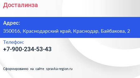 Досталинза по адресу 350016, Краснодарский край, Краснодар, Байбакова, 2 в дальнейшем Организация, размещена в следующих категориях: