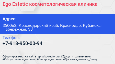Ego Estetic, косметологическая клиника по адресу 350063, Краснодарский край, Краснодар, Кубанская Набережная, 33 в дальнейшем Организация, размещена в следующих категориях: