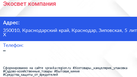Экосвет, компания по адресу 350010, Краснодарский край, Краснодар, Зиповская, 5 лит Х в дальнейшем Организация, размещена в следующих категориях: