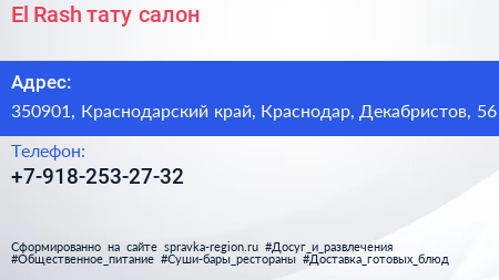 El`Rash, тату-салон по адресу 350901, Краснодарский край, Краснодар, Декабристов, 56 в дальнейшем Организация, размещена в следующих категориях: