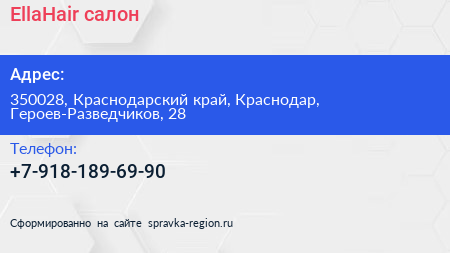 EllaHair, салон по адресу 350028, Краснодарский край, Краснодар, Героев-Разведчиков, 28 в дальнейшем Организация, размещена в следующих категориях: