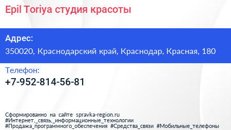 Epil Toriya, студия красоты по адресу 350020, Краснодарский край, Краснодар, Красная, 180 в дальнейшем Организация, размещена в следующих категориях: