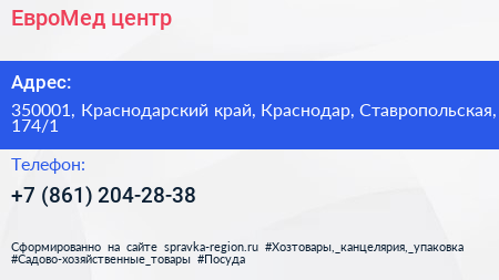 ЕвроМед, центр по адресу 350001, Краснодарский край, Краснодар, Ставропольская, 174/1 в дальнейшем Организация, размещена в следующих категориях: