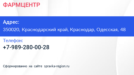 ФАРМЦЕНТР по адресу 350020, Краснодарский край, Краснодар, Одесская, 48 в дальнейшем Организация, размещена в следующих категориях: