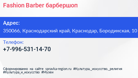 Fashion Barber, барбершоп по адресу 350066, Краснодарский край, Краснодар, Бородинская, 10 в дальнейшем Организация, размещена в следующих категориях: