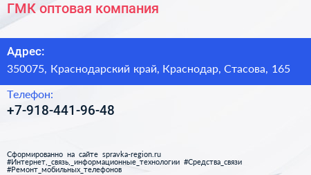 ГМК, оптовая компания по адресу 350075, Краснодарский край, Краснодар, Стасова, 165 в дальнейшем Организация, размещена в следующих категориях: