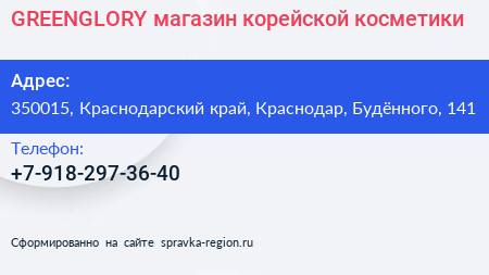 GREENGLORY, магазин корейской косметики по адресу 350015, Краснодарский край, Краснодар, Будённого, 141 в дальнейшем Организация, размещена в следующих категориях: