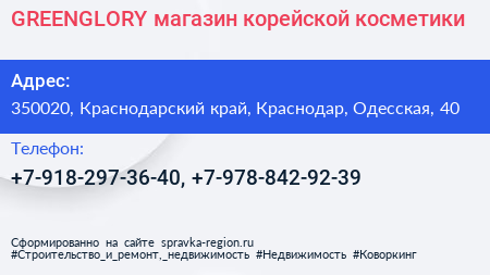 GREENGLORY, магазин корейской косметики по адресу 350020, Краснодарский край, Краснодар, Одесская, 40 в дальнейшем Организация, размещена в следующих категориях: