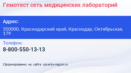 Гемотест, сеть медицинских лабораторий по адресу 350000, Краснодарский край, Краснодар, Октябрьская, 179 в дальнейшем Организация, размещена в следующих категориях: