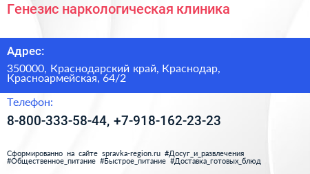 Генезис, наркологическая клиника по адресу 350000, Краснодарский край, Краснодар, Красноармейская, 64/2 в дальнейшем Организация, размещена в следующих категориях: