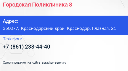 Городская Поликлиника №8 по адресу 350077, Краснодарский край, Краснодар, Главная, 21 в дальнейшем Организация, размещена в следующих категориях: