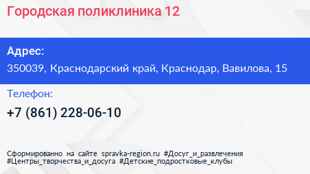 Городская поликлиника №12 по адресу 350039, Краснодарский край, Краснодар, Вавилова, 15 в дальнейшем Организация, размещена в следующих категориях: