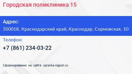 Городская поликлиника №15 по адресу 350018, Краснодарский край, Краснодар, Сормовская, 10 в дальнейшем Организация, размещена в следующих категориях: