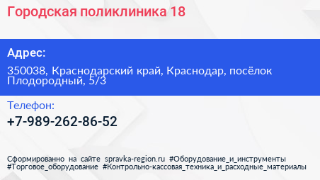 Городская поликлиника №18 по адресу 350038, Краснодарский край, Краснодар, посёлок Плодородный, 5/3 в дальнейшем Организация, размещена в следующих категориях:
