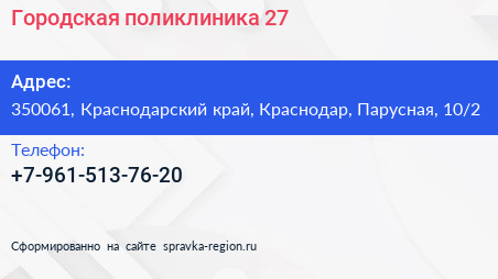 Городская поликлиника №27 по адресу 350061, Краснодарский край, Краснодар, Парусная, 10/2 в дальнейшем Организация, размещена в следующих категориях: