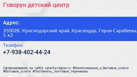 Говорун, детский центр по адресу 350028, Краснодарский край, Краснодар, Героя Сарабеева, 5 к3 в дальнейшем Организация, размещена в следующих категориях: