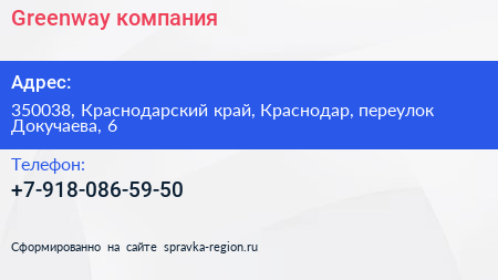 Greenway, компания по адресу 350038, Краснодарский край, Краснодар, переулок Докучаева, 6 в дальнейшем Организация, размещена в следующих категориях: