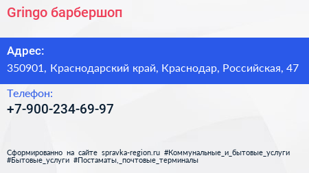 Gringo, барбершоп по адресу 350901, Краснодарский край, Краснодар, Российская, 47 в дальнейшем Организация, размещена в следующих категориях: