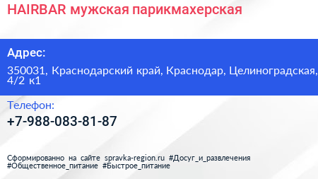 HAIRBAR, мужская парикмахерская по адресу 350031, Краснодарский край, Краснодар, Целиноградская, 4/2 к1 в дальнейшем Организация, размещена в следующих категориях: