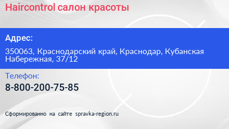 Haircontrol, салон красоты по адресу 350063, Краснодарский край, Краснодар, Кубанская Набережная, 37/12 в дальнейшем Организация, размещена в следующих категориях: