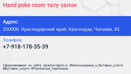 Hand poke room, тату-салон по адресу 350000, Краснодарский край, Краснодар, Чапаева, 81 в дальнейшем Организация, размещена в следующих категориях: