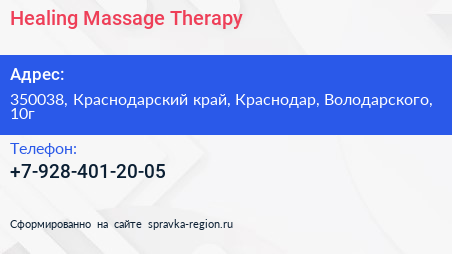 Healing Massage Therapy по адресу 350038, Краснодарский край, Краснодар, Володарского, 10г в дальнейшем Организация, размещена в следующих категориях: