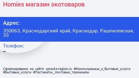 Homies, магазин экотоваров по адресу 350063, Краснодарский край, Краснодар, Рашпилевская, 33 в дальнейшем Организация, размещена в следующих категориях: