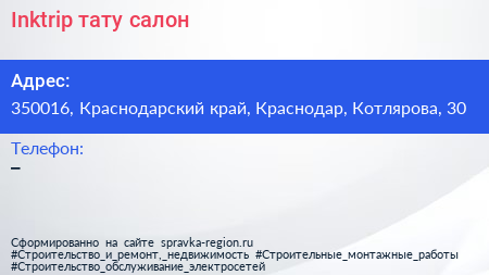 Inktrip, тату-салон по адресу 350016, Краснодарский край, Краснодар, Котлярова, 30 в дальнейшем Организация, размещена в следующих категориях: