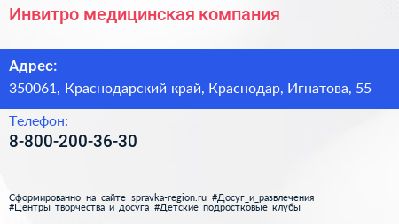 Инвитро, медицинская компания по адресу 350061, Краснодарский край, Краснодар, Игнатова, 55 в дальнейшем Организация, размещена в следующих категориях: