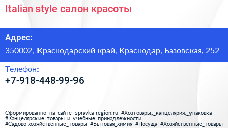 Italian style, салон красоты по адресу 350002, Краснодарский край, Краснодар, Базовская, 252 в дальнейшем Организация, размещена в следующих категориях: