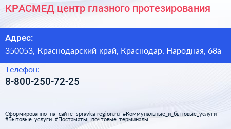 КРАСМЕД, центр глазного протезирования по адресу 350053, Краснодарский край, Краснодар, Народная, 68а в дальнейшем Организация, размещена в следующих категориях: