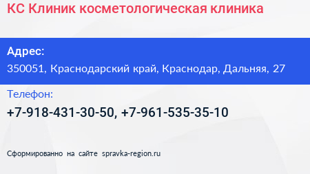 КС Клиник, косметологическая клиника по адресу 350051, Краснодарский край, Краснодар, Дальняя, 27 в дальнейшем Организация, размещена в следующих категориях: