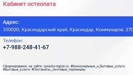 Кабинет остеопата по адресу 350020, Краснодарский край, Краснодар, Коммунаров, 270 в дальнейшем Организация, размещена в следующих категориях:
