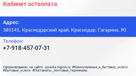 Кабинет остеопата по адресу 385141, Краснодарский край, Краснодар, Гагарина, 90 в дальнейшем Организация, размещена в следующих категориях:
