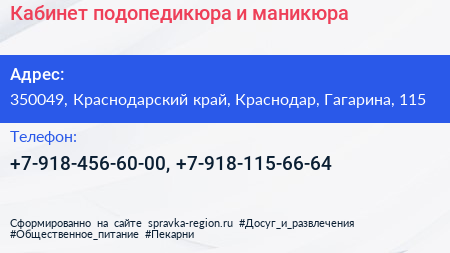 Кабинет подопедикюра и маникюра по адресу 350049, Краснодарский край, Краснодар, Гагарина, 115 в дальнейшем Организация, размещена в следующих категориях: