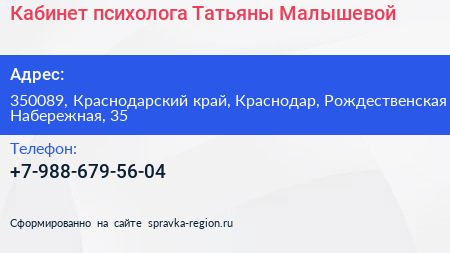 Кабинет психолога Татьяны Малышевой по адресу 350089, Краснодарский край, Краснодар, Рождественская Набережная, 35 в дальнейшем Организация, размещена в следующих категориях: