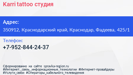 Karri tattoo, студия по адресу 350912, Краснодарский край, Краснодар, Фадеева, 425/1 в дальнейшем Организация, размещена в следующих категориях: