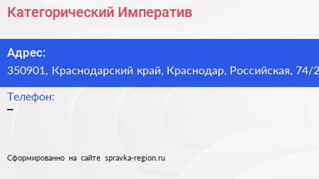Категорический Императив по адресу 350901, Краснодарский край, Краснодар, Российская, 74/2 в дальнейшем Организация, размещена в следующих категориях:
