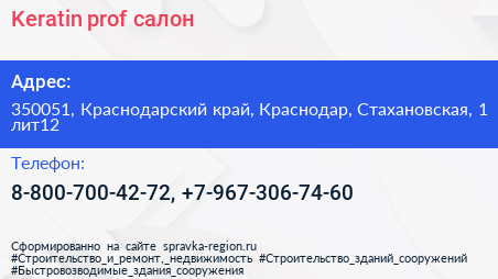 Keratin prof, салон по адресу 350051, Краснодарский край, Краснодар, Стахановская, 1 лит12 в дальнейшем Организация, размещена в следующих категориях:
