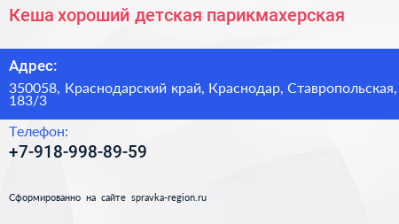 Кеша хороший!, детская парикмахерская по адресу 350058, Краснодарский край, Краснодар, Ставропольская, 183/3 в дальнейшем Организация, размещена в следующих категориях:
