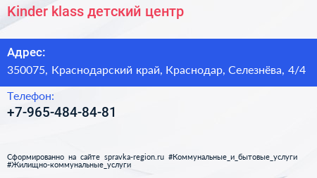 Kinder klass, детский центр по адресу 350075, Краснодарский край, Краснодар, Селезнёва, 4/4 в дальнейшем Организация, размещена в следующих категориях: